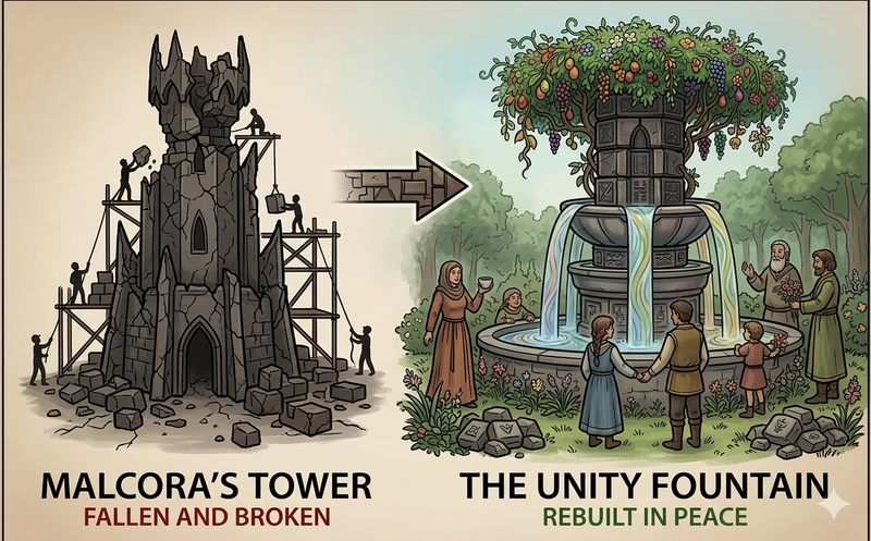 Beccuille gathers a resistance and eventually forces Malcora to step down. Peace is restored in the village, and Malcora's tower is torn down and replaced by a fountain of peace. The treasures of other regions are returned to their rightful owner in an attempt to reform the council. The northern woods people remain untrusted by all except Deandre of the Eastern Peaks.